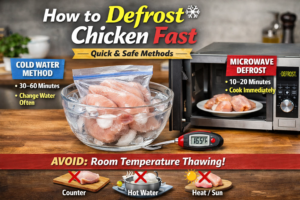 If you forgot to take chicken out of the freezer and need it ready fast, you’re not alone! The good news is you can defrost chicken quickly without risking food poisoning or ruining the texture—as long as you do it the right way. In this guide, you’ll learn the fastest safe methods, what NOT to do, and helpful tips for cooking frozen chicken correctly.
